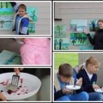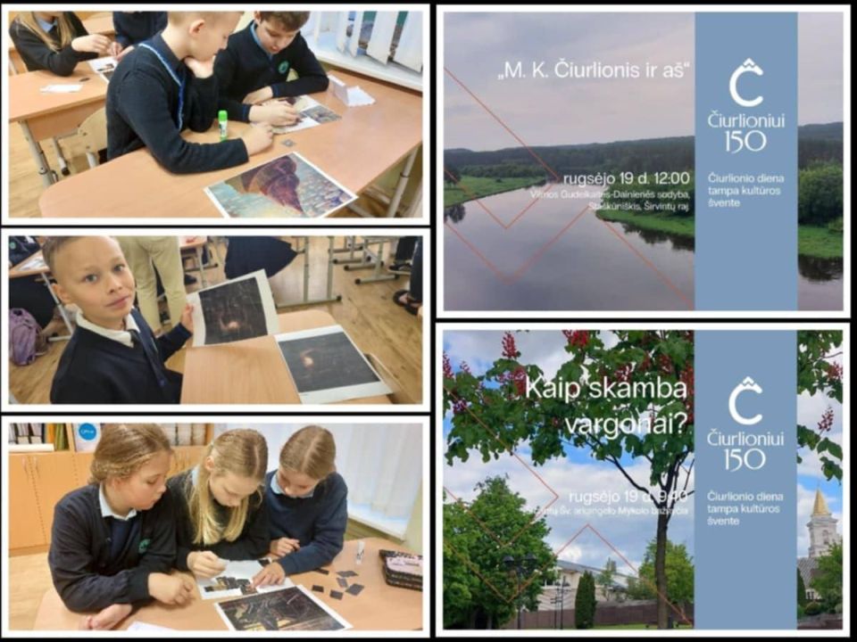 Rugsėjo 19 d. 4e klasės mokiniai (mokytoja Rūta Tamašauskienė) dalyvavo visoje Lietuvoje rengiamoje jubiliejinėje programoje „Čiurlioniui - 150“. Rugsėjo 1-ąją 4e pradėjo pamoką M. K. Čiurlionio 150-osioms gimimo metinėms paminėti. Pamokos metu mokiniai klijavo M. K. Čiurlionio „Pasakų dėliones“. Sukurtose vizualizacijose „Čiurlioniui 150. Čiurlionio diena tampa kultūros švente“ mokytoja su mokiniais kvietė į dvi edukacijas: Širvintų Šv. arkangelo Mykolo bažnyčioje – „Kaip skamba vargonai?“ ir „Čiurlionis ir aš“. Edukacijoje „Kaip skamba vargonai?“ mokytoja Rūta papasakojo apie Kastuko vaikystę, visos Čiurlionių šeimos šiltą bendravimą ir įdomų menininko kūrybinį kelią. Rodydama M. K. Čiurlionio tapytų paveikslų reprodukcijas mokytoja paaiškino, ką jose menininkas norėjo pavaizduoti. Vėliau mokiniai klausėsi vargonų muzikos – M. K. Čiurlionio Pastoralės, fugos cis-moll ir J. Naujalio Preliudo G-dur. Kūrinius atliko bažnyčios vargonininkas Dailius Kavalevskis. Vėliau Dailius mokiniams papasakojo apie vargonus, parodė jų veikimą ir kvietė vaikus pamėginti pagroti vargonais. Antroje edukacijoje „Čiurlionis ir aš“, gamtoje sėdėdami ant akmenų ir klausydami M. K. Čiurlionio simfoninių poemų „Miške“ ir „Jūraׅ“, mokiniai piešė gamtą, galvodami, kaip ją galėjo nutapyti Čiurlionis. Vėliau mokiniai valgė virtinukus su mėlynėmis, kuriuos buvo labai pamėgęs M. K. Čiurlionis, ir gėrė gardžią mėtų arbatą. Edukacijos pabaigoje vyko pleneras „Čiurlionis ir aš“. Sodybos šeimininkai išrinko tris gražiausius piešinius, kurių autoriai buvo apdovanoti. „Ir taip skrendam vis toliau. O štai ir jūra. Bangos didelės didelės. „Labą dieną!“ – šaukiame iš viršaus. „Labą dieną!“- ūžia bangos, o mes kylame aukštyn aukštyn“,- šiais M. K. Čiurlionio žodžiais žmonai Sofijai ketvirtokai baigė pažintį su iškiliu Lietuvos menininku.