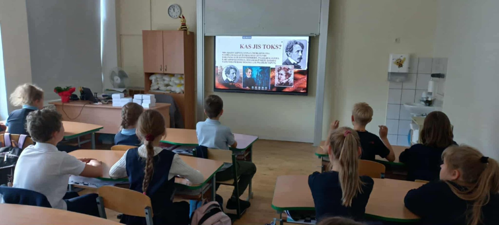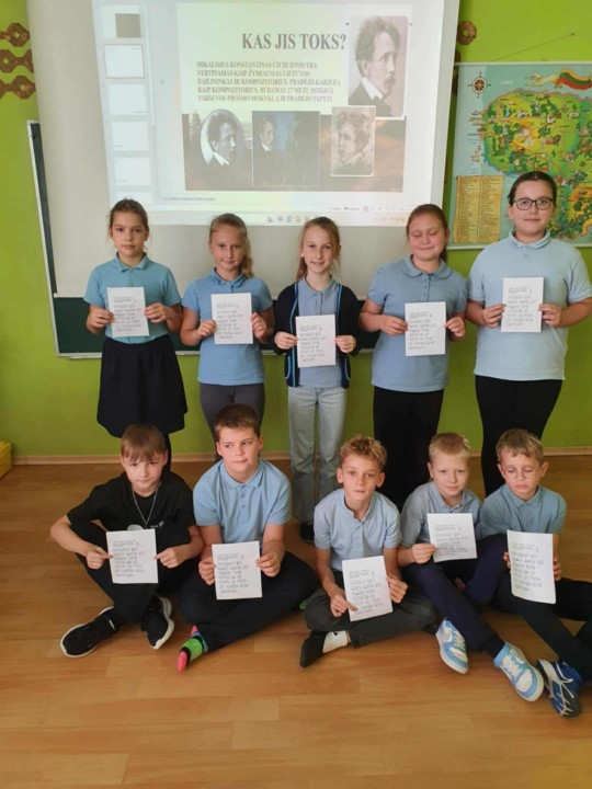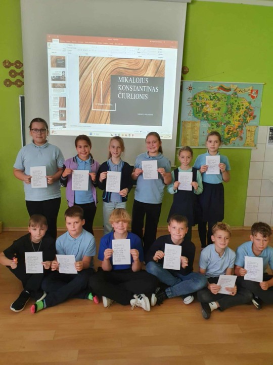 Rugsėjo 22-ąją minimas 150-asis kompozitoriaus ir dailininko M. K. Čiurlionio gimtadienis. M. K. Čiurlionio gimtadienį ketvirtokai paminėjo visą savaitę atlikdami įvairias veiklas. Mokiniai susipažino su jo biografija. Per dailės pamoką grožėjosi žinomiausiais paveikslais ir atkartojo M. K. Čiurlionio tapybos darbus. Klausėsi kompozitoriaus muzikos skambesio. Ketvirtokai rašė laiškus M. K. Čiurlioniui ir juos užšifravo, pagal ženklų abėcėlę perskaitė kompozitoriaus mintis. Apie mažojo Kastuko vaikystę sužinojo rašydami diktantą. Veiklas parengė mokytoja D. Vinslauskienė.